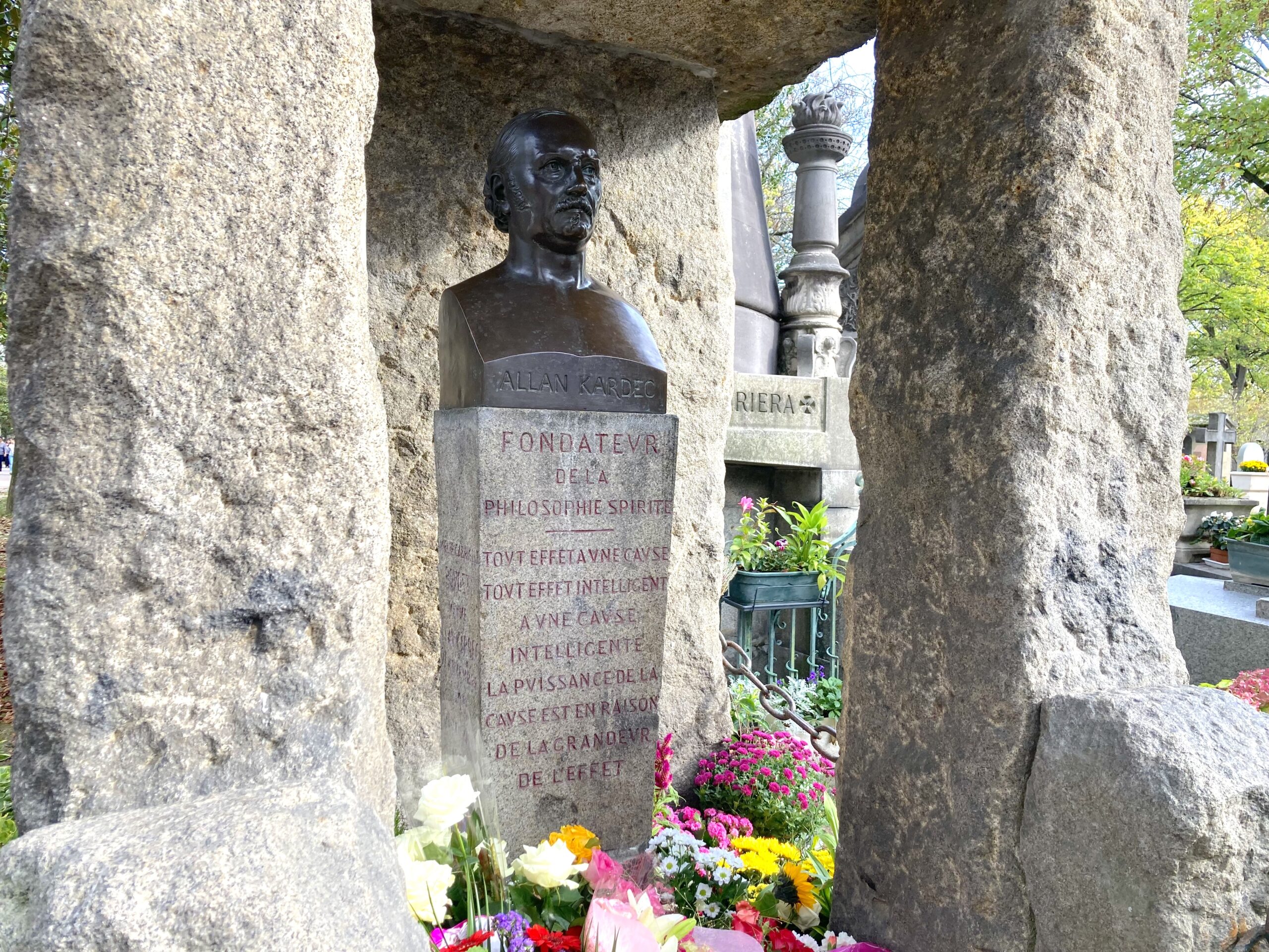 Il repose aujourd’hui au cimetière du Père Lachaise : un buste de bronze au centre d’un mausolée de pierre, en forme de dolmen, sur lequel sont gravés ces mots : « Naître, mourir, renaître encore et progresser sans cesse, telle est la Loi ».